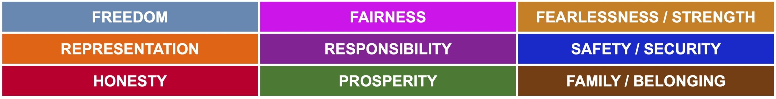 The overarching benefit statement worked well across the focus groups and participants believe these things should be benefits of a working democracy, and they value these benefits. However, they don’t believe democracy is delivering these benefits now. Survey participants identified these as the most important benefits possible in a democracy where freedoms are protected.